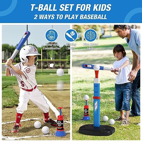 3 WAYS TO PLAY – ①Kids basketball hoop: with 2 basketballs for multi-player games. ②Kids baseball tee stand: with stretchable bat and 4 baseballs. ③Automatic pitching machine: hitting an automatically ejected baseball. 2 in 1 kids basketball hoop and tball sets provide you and your family or friends to enjoy a fun sport game and have more fun.