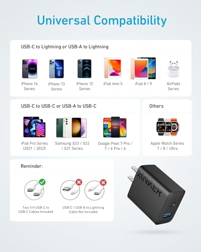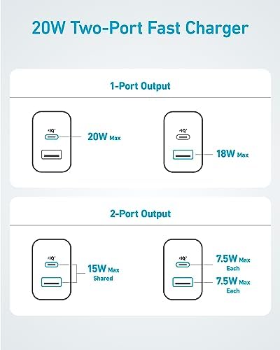 Model Number A2348 Anker Charger (2-Port, 20W) The Dual-Port Compact Fast Charger Versatile Compatibility For USB-C to USB-C Cable Compatible Devices: iPhone 15 / 15 Pro / 15 Pro Max /iPad Pro 11-inch (1st Generation or Later) /iPad Pro 12.9-inch (3rd Generation or Later) /iPad Air (4th Generation or Later) /iPad mini (6th Generation) Versatile Compatibility For USB-C Plug Compatible Devices (USB-A or USB-C to Lightning Cable Not Included): iPhone 14 Series /iPhone 13 Series /iPhone 12 Series /iPhone SE (2nd Generation) /iPad mini (1st-5th Generation) /iPad Air (1st-3rd Generation) /iPad Pro 12.9-inch (1st-2nd Generation) /AirPods Pro /AirPods (1st-3rd Generation) /Apple Watch (Series 1-8)/ Apple Watch Ultra Versatile Compatibility Other Devices: AirPods Pro / 3 Nintendo Switch Total Wattage 20W Input 100-240V~1A 50-60Hz Output 1 Port Output USB-C: 5V⎓3A / 9V⎓2.22A / 12V⎓1.67A (20W Max) USB-A: 5V⎓3A / 9V⎓2A / 12V⎓1.5A (18W Max) Output 2-Port Output USB-C + USB-A: 5V⎓1.5A + 5V⎓1.5A (15W Max) Weight 52 g Dimensions 27.7 × 42.8 × 44.5 mm / 1.0 × 1.6 × 1.7 in Note To charge Apple devices such as iPhones with a Lightning connector, you need to use a USB-C to Lightning cable (not included). Note Anker 20W Wall Charger (2 Ports) meets the standards of UL 62368-1:2019/R:2021-10 and CSA C22.2 No. 62368-1:2019/U1:2021-10.