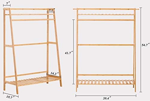 Material: Bamboo Color:Nature Weight: 13.9 lbs(6.3 kg) Dimensions: 39.4” L*15.7”W*54.7”H Height of Hanging Rod:Bottom shelf to hanging rod 41.7” H Wide of Each Tier:Bottom shelf 14.5” W ;Top shelf 7.2” W