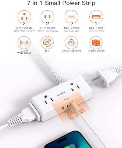 【Cruise Accessories Must Haves 】The small cruise power strip with NO surge protection. The compact size (4.5*1.1*1.8 IN) takes up less space on your desk or luggage, a must have accessory for travel, dorm room, home, office, bedroom, kitchen, etc.