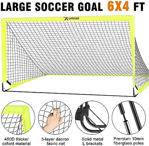 【Quality & Durability Above All Else】6×4 ft large Pop up soccer goals set of 2,that constructed from durable 450D thickened oxford cloth ,10MM high-elastic fiberglass poles, sturdy 3-layer Dacron Soccer Net and reinforced inner bungee cord. With good toughness,wear resistance and resilient that keeps the kids soccer goal all-weather durability and last for years without losing stability. The std size 3 soccer ball made of durable TPU, designed to resist abrasion and last longer.