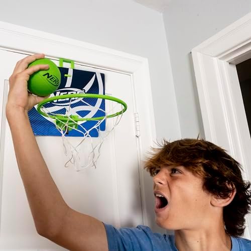 Bring all the fun of basketball indoors with the NERF Nerfoop Mini Over the Door Basketball Hoop Set! This all-in-one indoor mini basketball hoop set has everything kids need to get the game started right in their very own bedroom. This toy basketball set comes with (1) over the door kids basketball hoop and (1) mini NERF foam basketball so kids can play right out of the box. Simply hang the mini hoop over any standardized door and you’re ready to play in seconds. This classic basketball toy has been a favorite of kids everywhere for over 50 years, and it is still going strong! Shoot from across the room and challenge your friends to 1 on 1 games for nonstop basketball action! Plus the soft foam 4″ inch mini basketball is fun indoors so kids can play worry free. So if your kid is looking to bringing some basketball excitement to their room, grab them the NERF Nerfoop Mini Over the Door Basketball Hoop Set and start the game today!