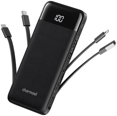 🔋【Portable charger with built in cables】Slim portable charger built-in 4 cables included 3 output cables and 1 input cable. Total 3 output cables can charge almost for all types port devices. Such as for iPhone, iPad, for Samsung, for other USB C port phones, tablets, and also for Micro devices. All in one portable charger, you would not need to carry various cables or adapter any more!!!