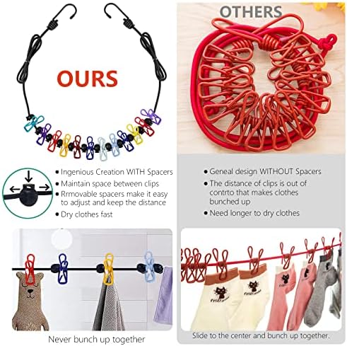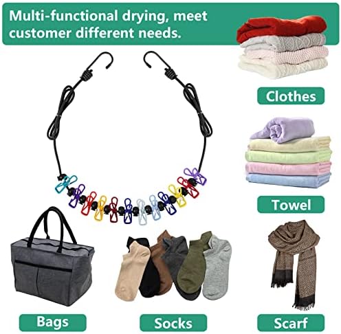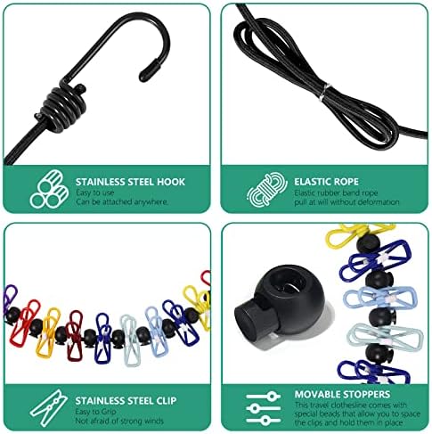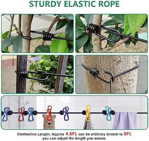 1. [Perfect Design]: Clothesline length 4.6Ft, net weight 0.4ib, the longest stretch 9Ft, packing weight 0.48ib, with 12 colorful clothesline clamps, 13 windproof and non-slip clamps, with positioning bead design, can move smoothly left and right, the rope has elasticity, no need to worry about the clothes due to the weight or the wind gathered to improve the drying effect. With two disposable compressed towels, outdoor travel can be used for washing face and hands, small area, easy to carry.